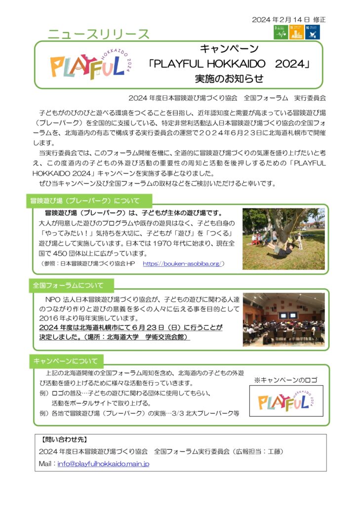 PLAYFUL HOKKAIDO 2024のニュースリリースを出しました。(2/14修正)