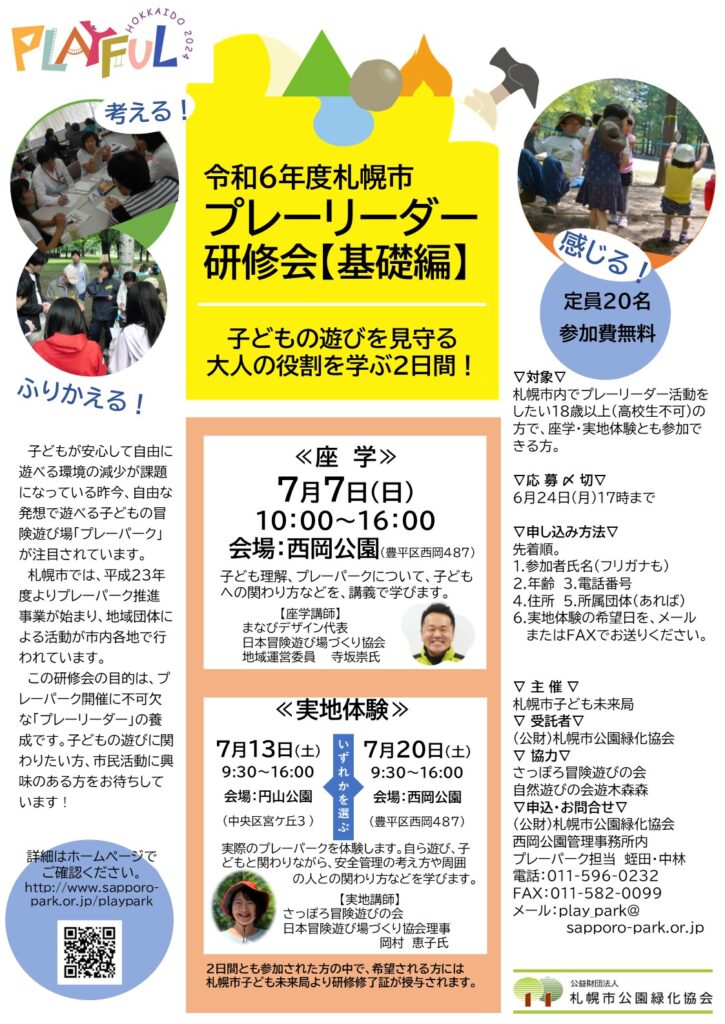 <活動紹介>札幌市プレーリーダー研修会 活動紹介 2024.05.26 公益財団法人札幌市公園緑化協会さんが札幌市の受諾を受けて実施する研修会です。 プレーパークさっぽろ <HP> <Facebook>